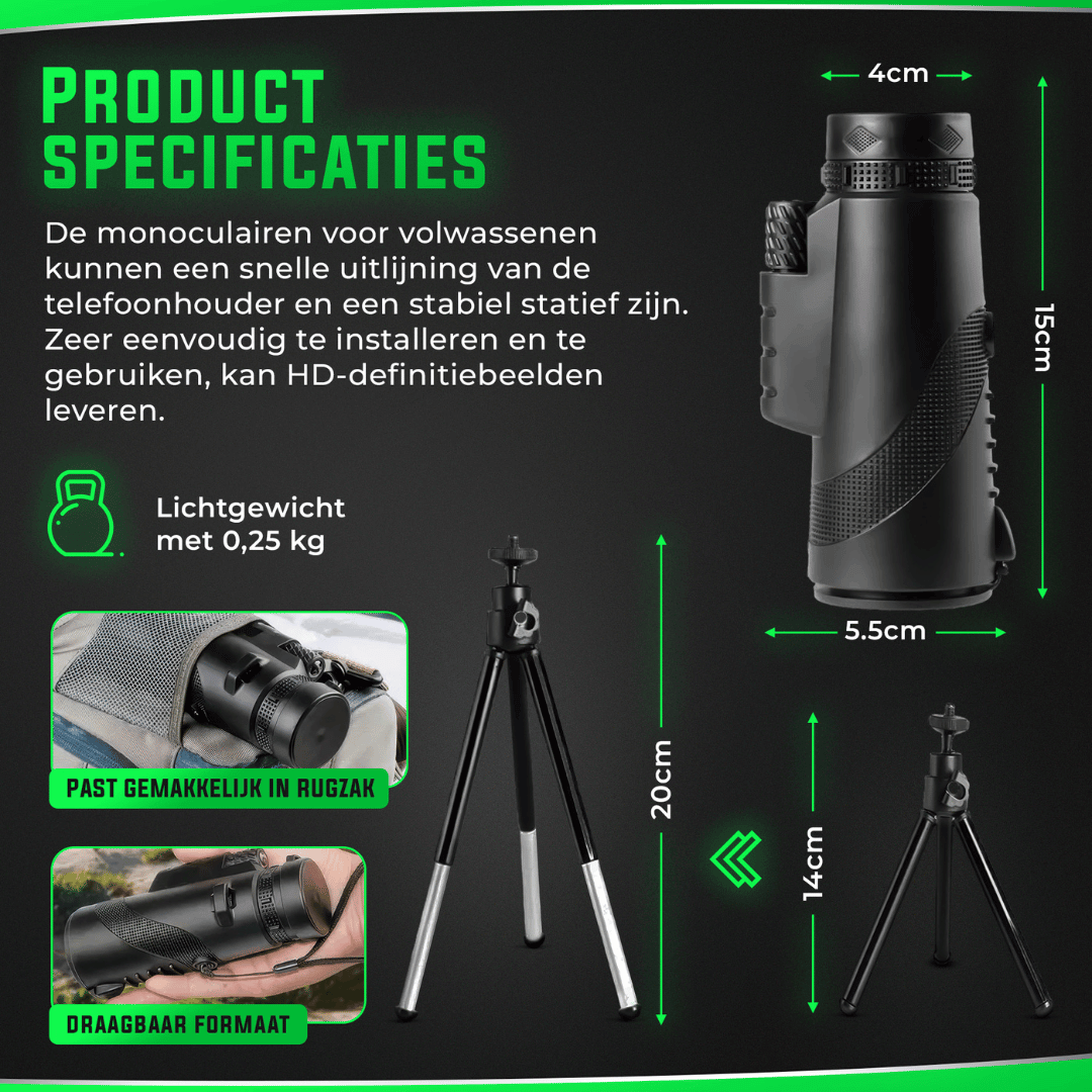 De AstroZoom Monoculair biedt een adembenemende vergrotingstechnologie, allemaal verpakt in een compact en draagbaar ontwerp dat gemakkelijk in je zak past.
