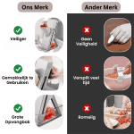 De ChopWise Multifunctionele Groentesnijder is ontworpen met jouw veiligheid in gedachten. Het unieke ontwerp voorkomt dat je handen ooit in de buurt van de ingebouwde messen komen, waardoor dit gereedschap de veiligste optie is voor het snijden van groenten en fruit. Je kunt nu moeiteloos genieten van het bereiden van maaltijden zonder je zorgen te maken over snijwonden of blessures.