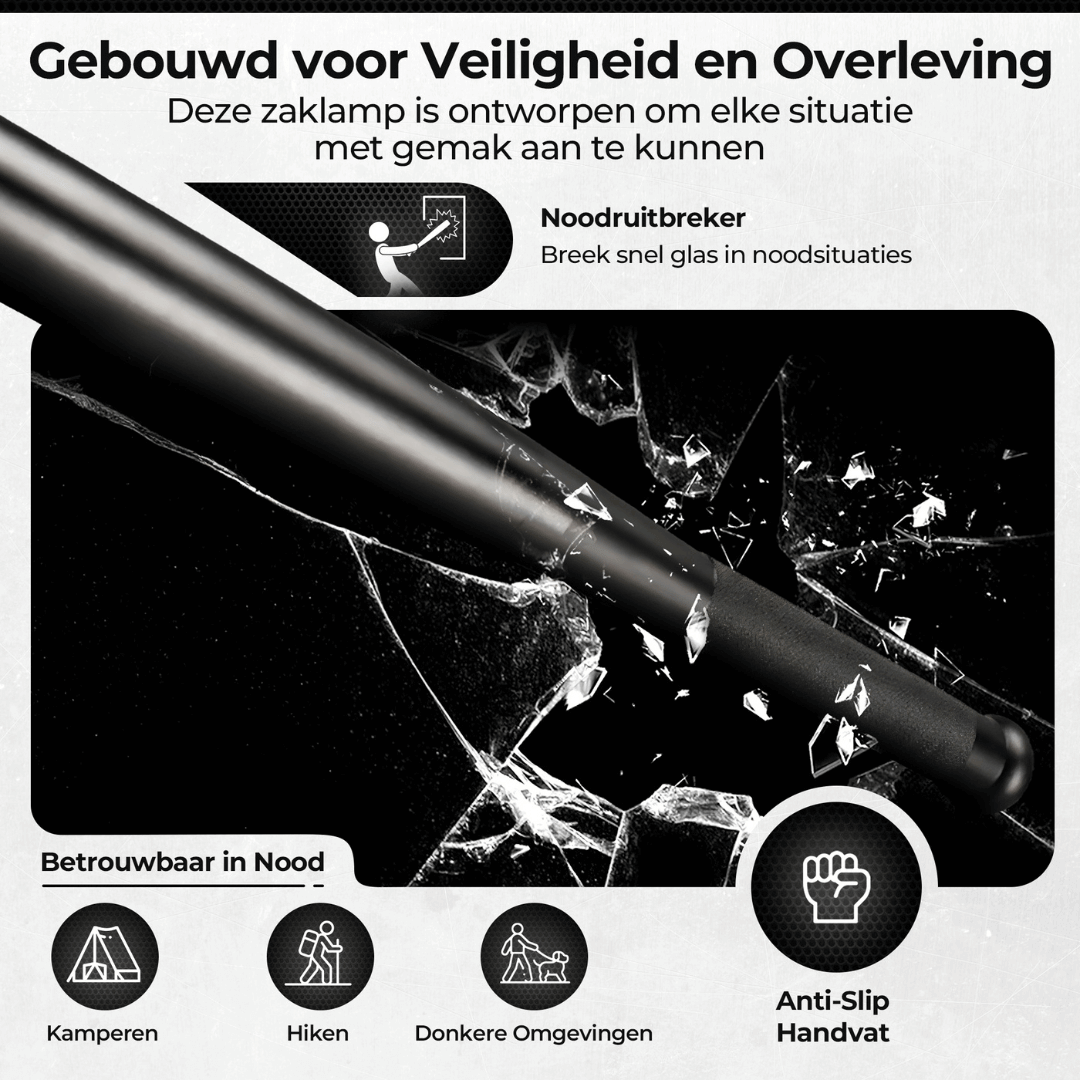Met de Flash Bat hoef je je nooit zorgen te maken over ruige omstandigheden. Deze krachtige zaklamp is gebouwd om de zwaarste beproevingen te doorstaan – regen, modder, en schokken maken geen kans.