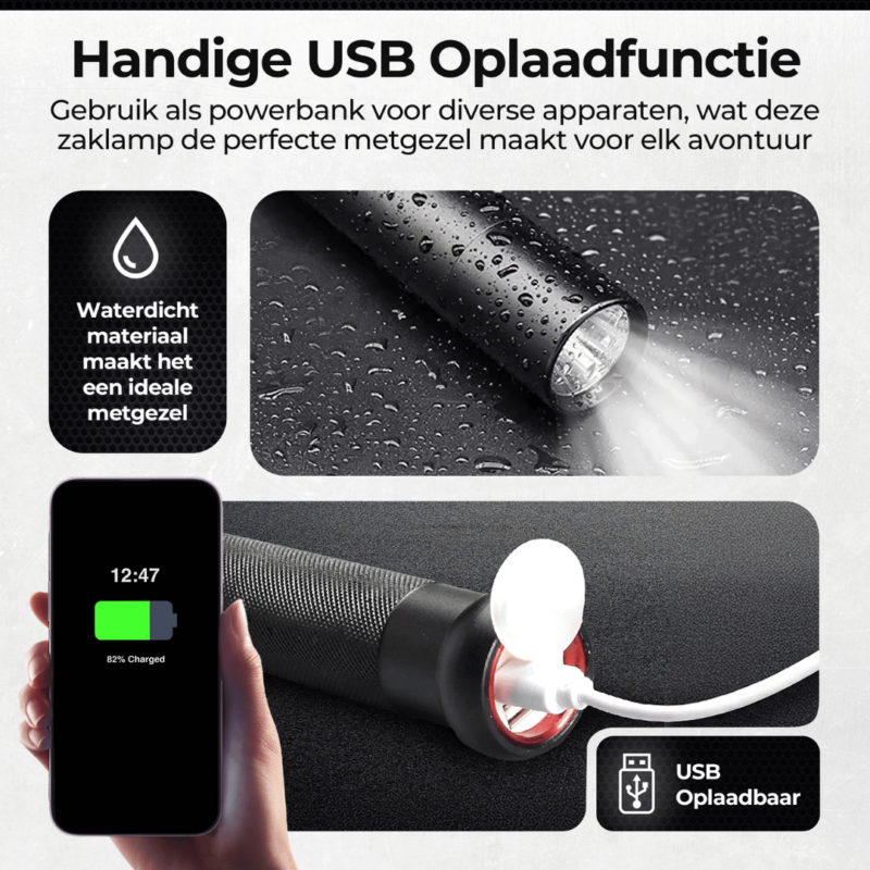 Stel je voor dat je nooit meer zonder stroom zit, zelfs niet tijdens je spannendste avonturen. De Flash Bat fungeert niet alleen als krachtige zaklamp maar ook als betrouwbare powerbank, zodat je altijd verbonden blijft.