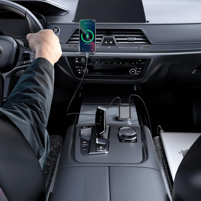 Geniet van een georganiseerde, stijlvolle auto terwijl je apparaten razendsnel worden opgeladen. Praktisch, slim én elegant – precies wat jouw auto verdient!