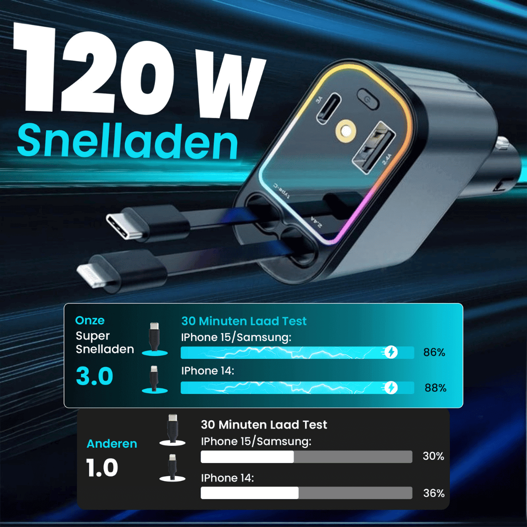 De FluxStar 4-in-1 Snelle Autolader is dé oplossing! Met 120W power en slimme technologie laadt deze autolader al je apparaten in recordtijd op.