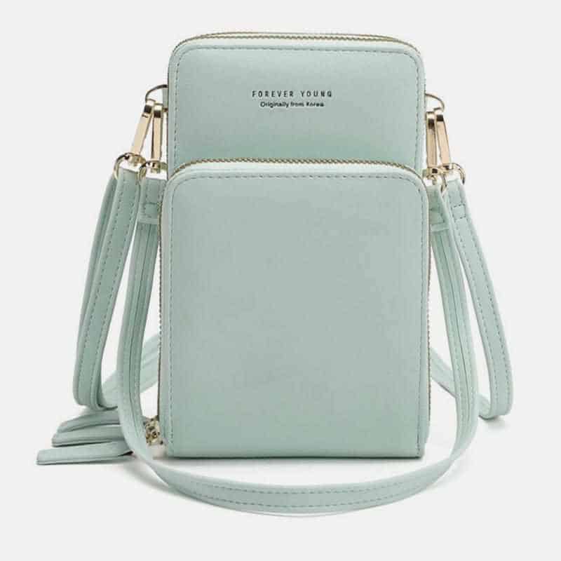 De telefoontas heeft verstelbare en afneembare bandjes, zodat het gedragen kan worden als een crossbody of als telefoon schoudertasje.