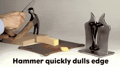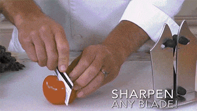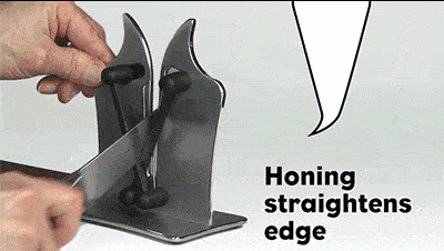 Plaats je botte mes in de opening van de messenslijper, ga een aantal keer heen en weer en binnen een mum van tijd is je mes vlijmscherp!