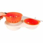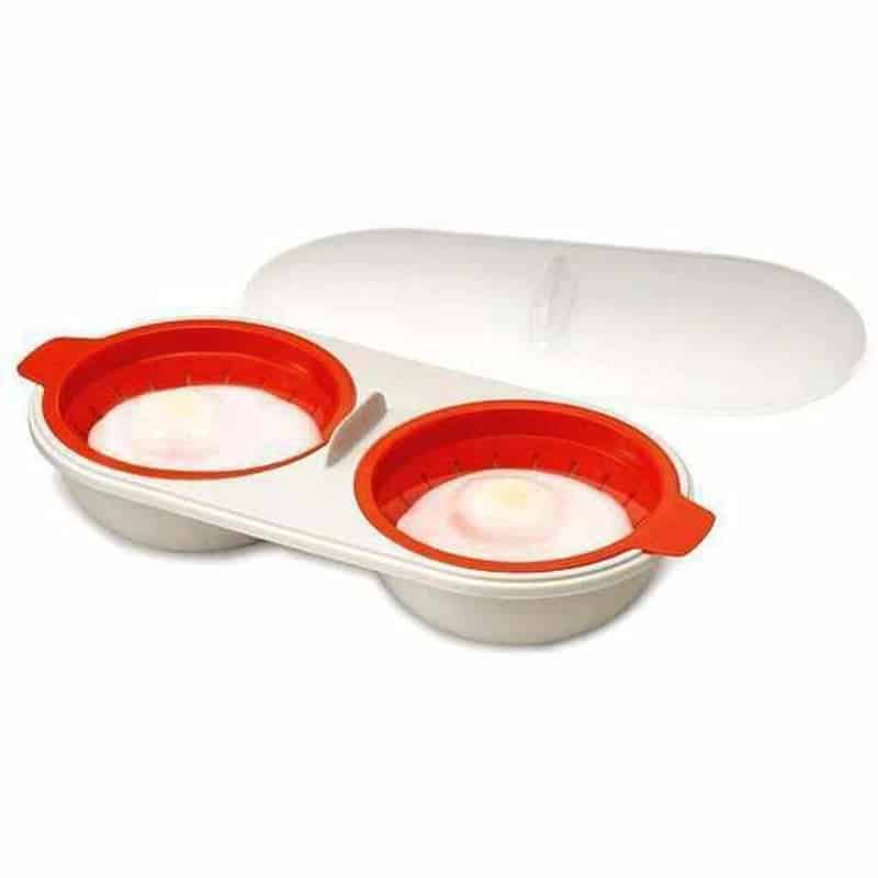 Vul eerst elk compartiment met water tot aan de vullijn en breek vervolgens een ei in elk van hen met behulp van de geïntegreerde eierbreker. Deksel erop en de magnetron op volle kracht gedurende de aangegeven tijd. Om te serveren, tilt u eenvoudig elk ei op met behulp van zijn individuele vergiet. Vaatwasser- en magnetronbestendig. Geschikt voor gebruik in magnetrons tot 900 watt.
