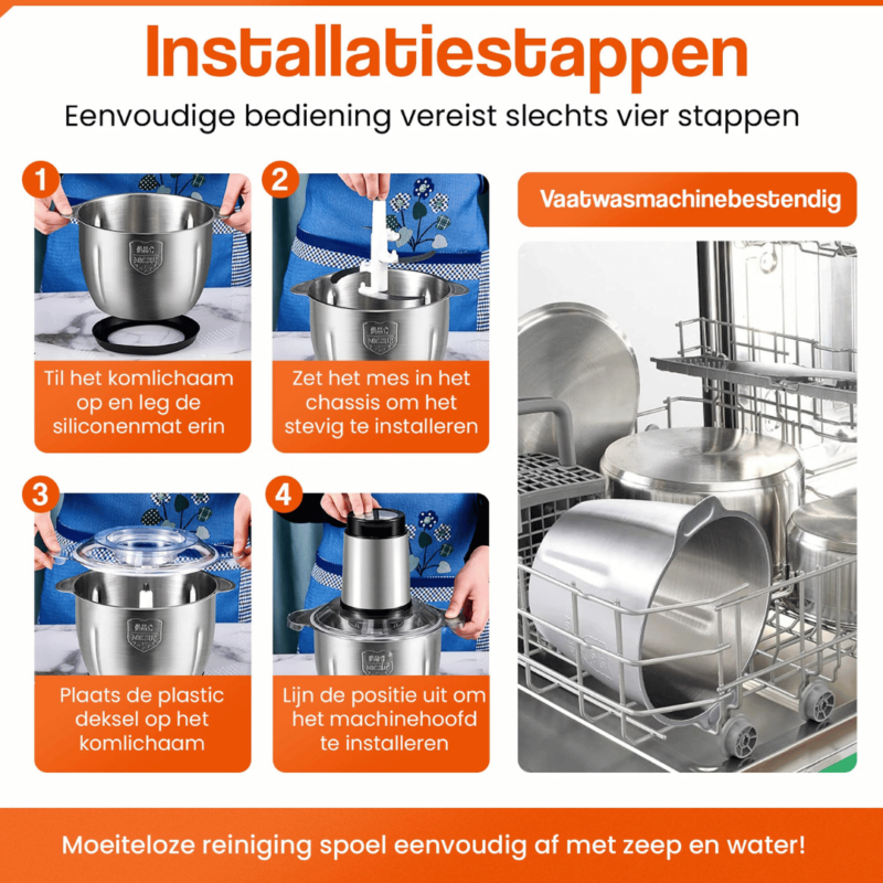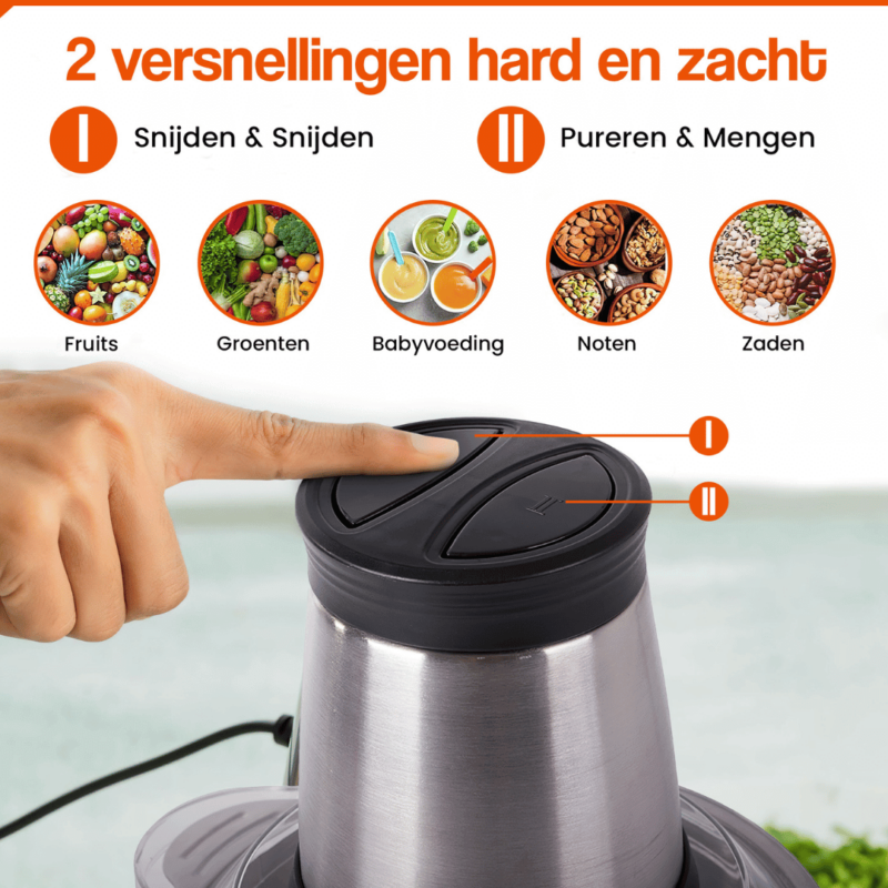 Met zijn krachtige 4-messensysteem en grote capaciteit hak je alles in seconden – van vlees en groenten tot noten en fruit. Bespaar tijd, geniet van perfect gesneden ingrediënten, en maak koken weer leuk!