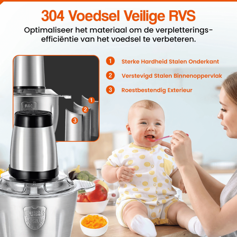 Kies voor duurzaamheid en veiligheid in jouw keuken met de drievoudige roestvrijstalen kom van de ProFoodi Voedselhakker.