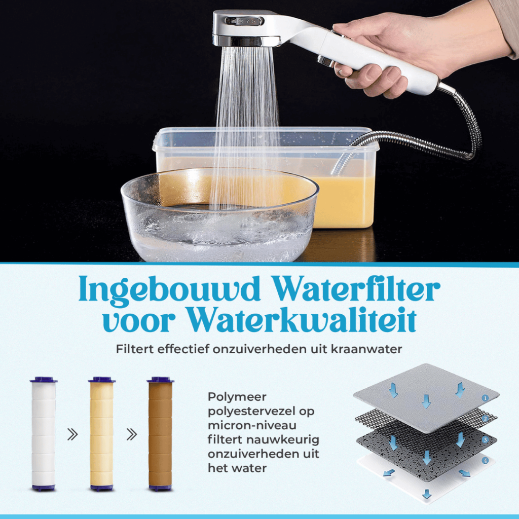 Met een ingebouwd waterfilter voor optimale waterkwaliteit, worden onzuiverheden zoals roest, kalk en sediment effectief verwijderd, waardoor je huid zachter aanvoelt en je haar stralender wordt.