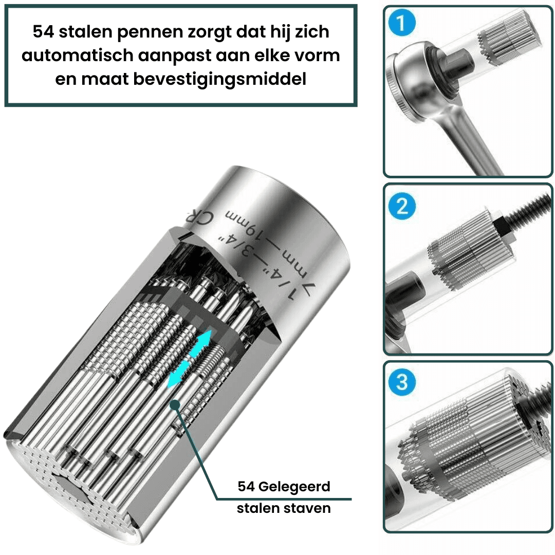 Geen uren meer verspillen aan het zoeken naar de juiste maat socket of moersleutel. Met de SuperSocket grijp je elke bout of moer in een handomdraai. Dit efficiënte gereedschap bespaart je tijd en moeite, waardoor je sneller kunt werken en meer kunt doen.