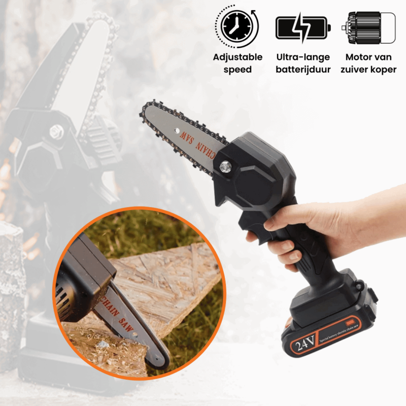 Deze mini kettingzaag is je betrouwbare partner voor elke uitdaging in de tuin, waardoor zware, onhandige gereedschappen verleden tijd zijn.